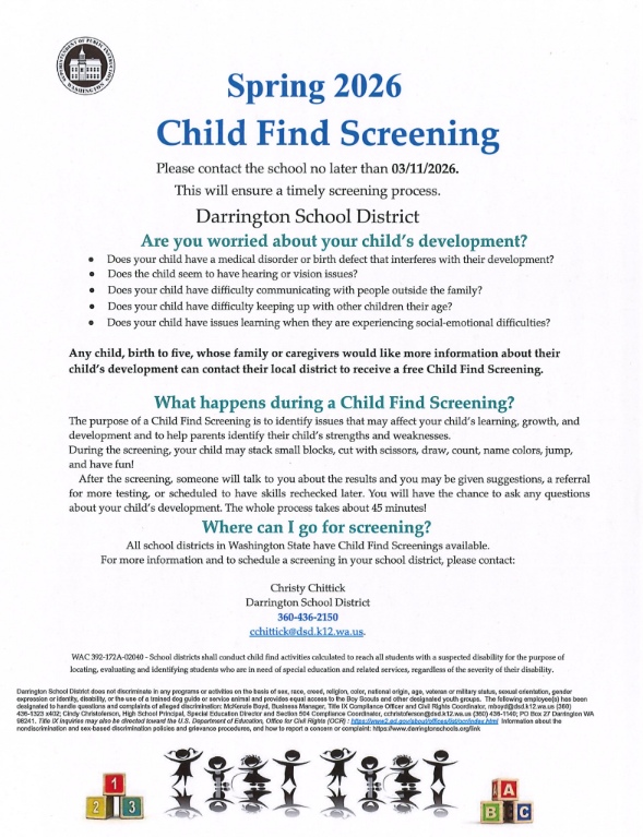 Darrington School District is seeking applications from District residents interested in being appointed to committees to write the “for” and “against” statements for the Snohomish County and Skagit County Local Voters’ Pamphlets related to the District’s Replacement Educational Programs and Operation Levy ballot measure to be considered at the April 28, 2026 election. Interested residents should send their name, address, email address, phone number and committee name (or which position they represent) to: McKenzie Boyd, Business Manager, Darrington School District, 1065 Fir Street, PO Box 27, Darrington, WA 98241 or via email at mboyd@dsd.k12.wa.us by February 23, 2026. The Board will take action on the appointments at its February 24, 2026 meeting. Contact information for individuals appointed by the Board may be listed in the local voters’ pamphlets. For more information, please reference the Snohomish County “Local Voters’ Pamphlet Administrative Rules” available at: www.snohomishcountywa.gov/5730/Place-a-Measure-on-the-Ballot.
