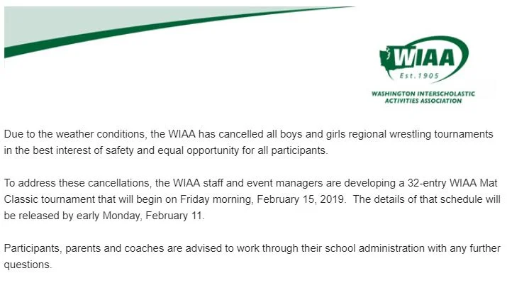 WIAA has canceled regional wrestling tournaments statewide this weekend in anticipation for record snowfall across Washington. All qualified wrestlers will move on to state, with details to follow for updated Mat Classic schedules.